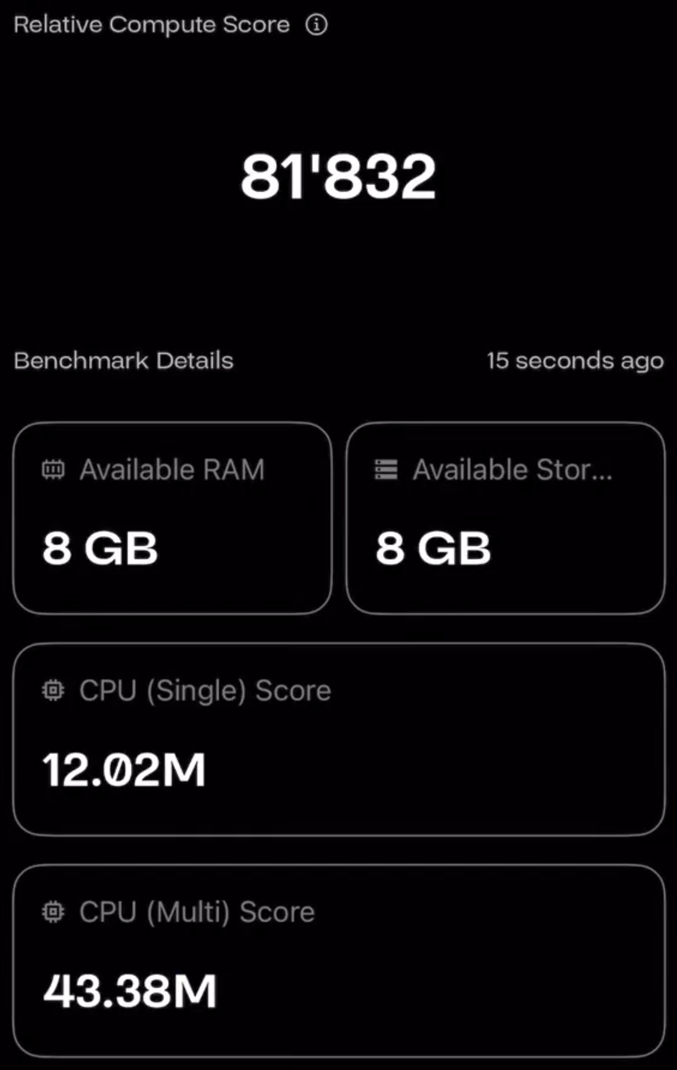 The results of the latest benchmark tests, show on the display of the processor app, if you tap the "Compute Score" card. Each Benchmark Metric card displays the exact results from the last benchmark test. The Relative Compute Score on top represents how this device scores against the global score of all devices in the Acurast network.