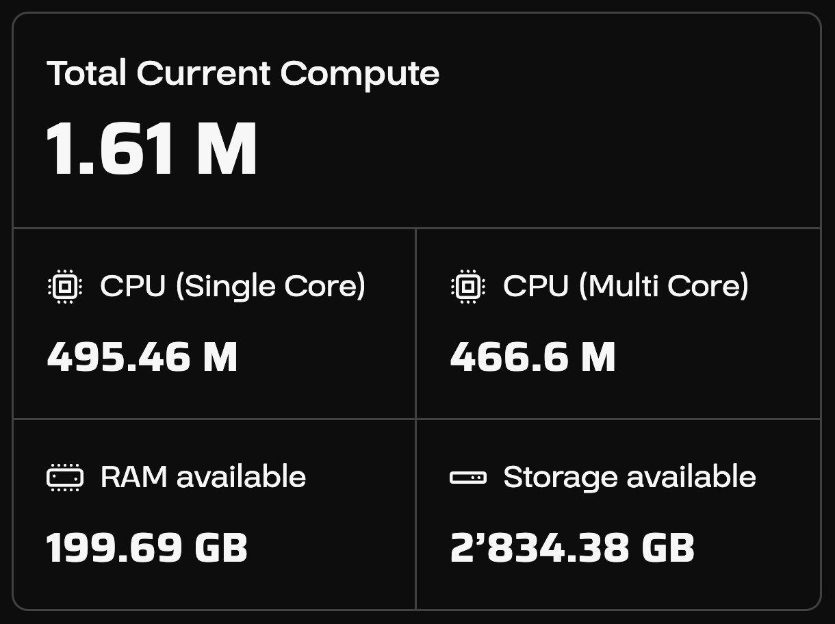 The measured compute of a Compute Provider is displayed as Current Compute on the Staking frontend. It represents the current total compute power measured across all of a provider's devices. Compute is broken down into four benchmark metrics: CPU Single Core, CPU Multi Core, RAM, and Storage.